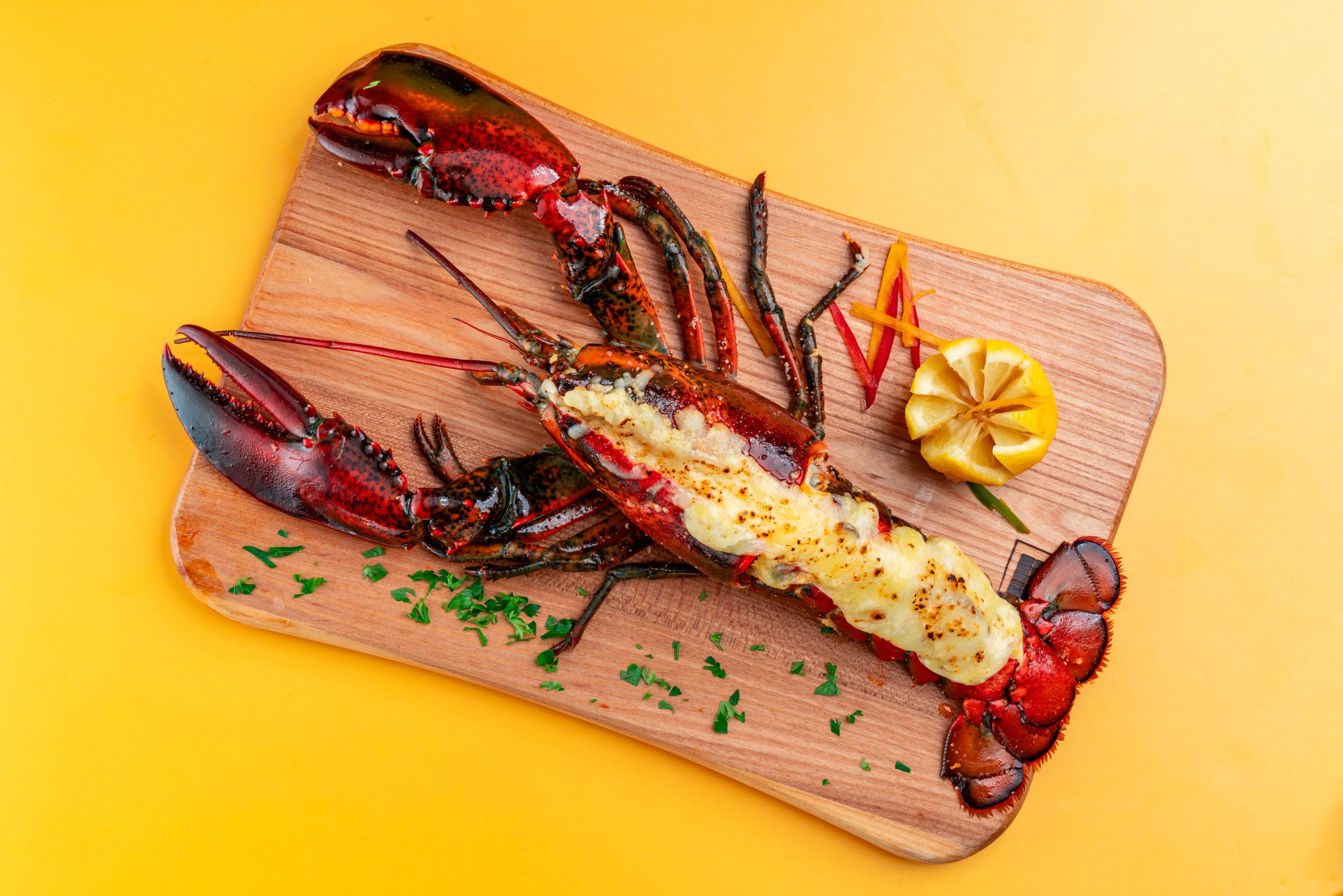 Classic baked live lobster in a creamy mushroom sauce, topped with cheese and golden crusted to perfection